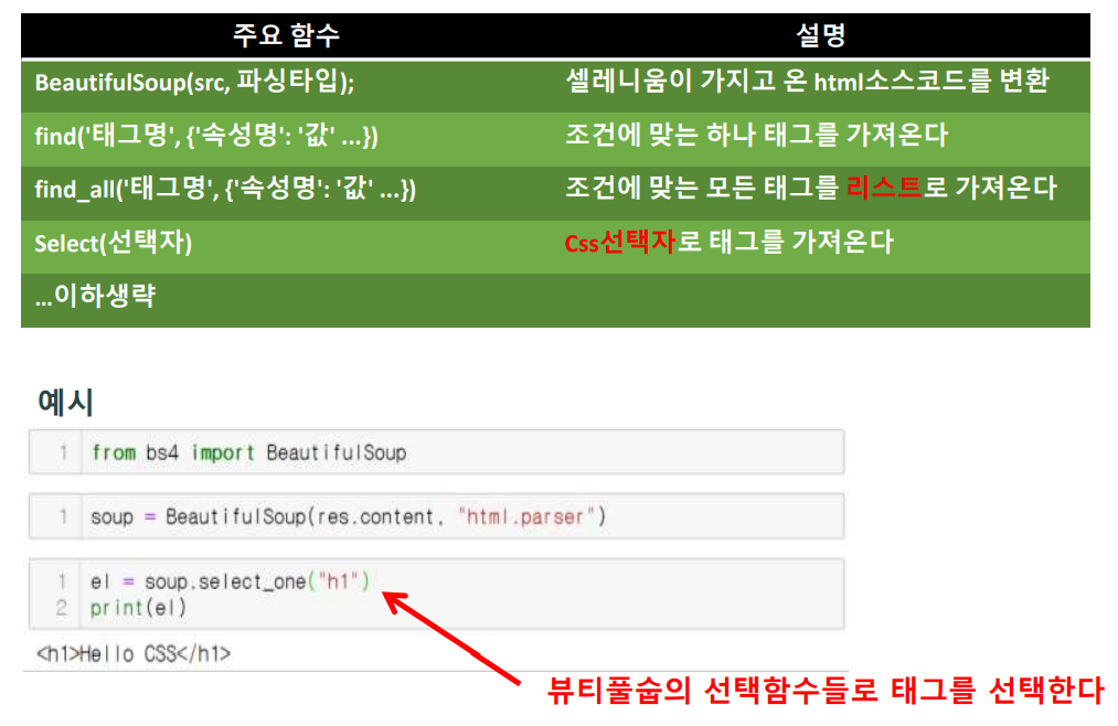 - 뷰티풀숩(Beautiful Soup)은 스크린 스크래핑(screen-scraping) 프로젝트를 위해 설계된 파이썬 라이브러리